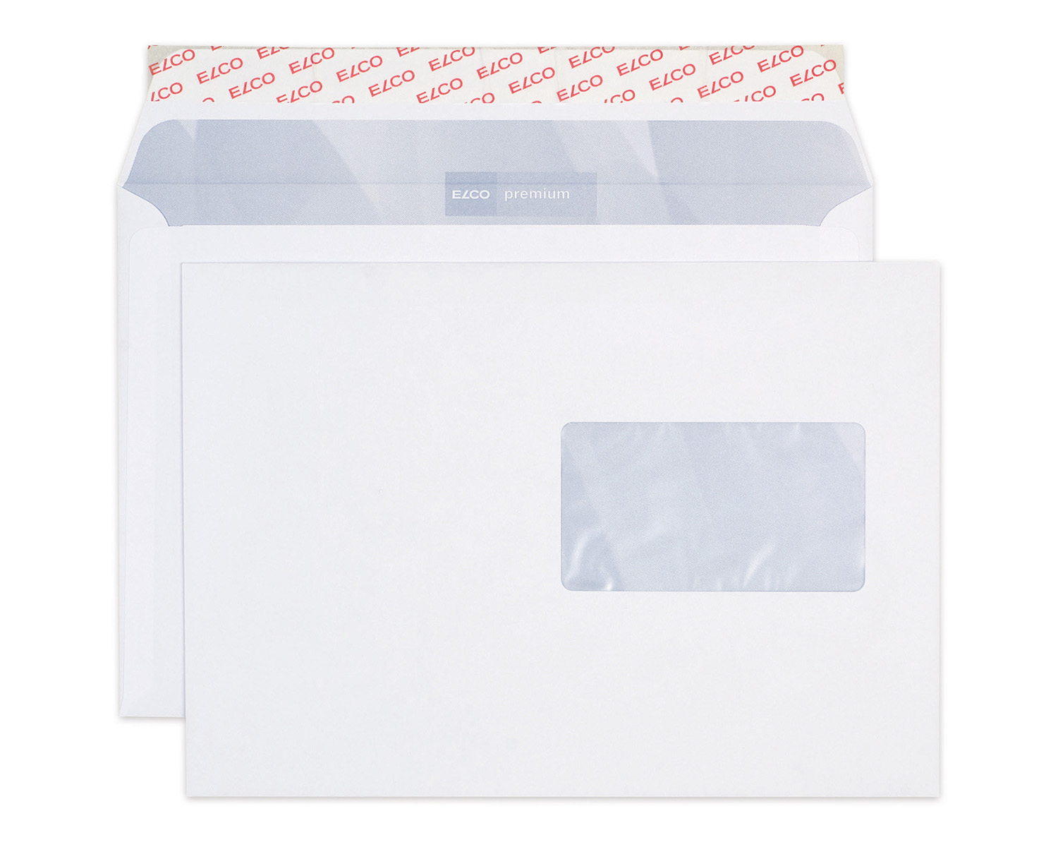 Hochweisses Premium B5-Kuvert von ELCO mit Fenster rechts und mit Haftklebeverschluss in der 500 Stk.-Box. Mit Innendruck "ELCO premium". Spitzenqualität aus der Schweiz.