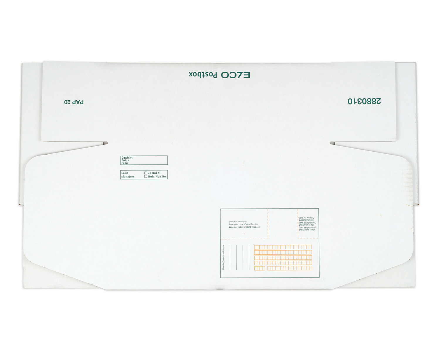 Versandverpackung mit Steckverschluss und Vordruck für Adresse und Absender. Aus stabilem, weissen Karton. Einfache Handhabung.