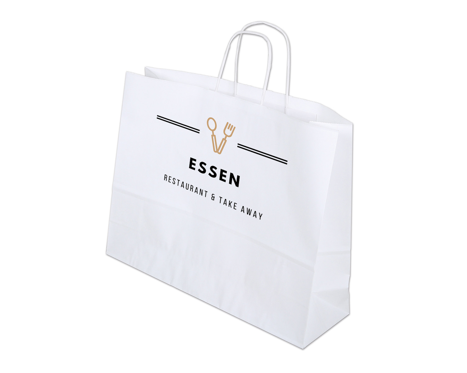 Sac en papier imprimable avec cordelette torsadée en papier kraft indéchirable, 100 g/m². Poignée élégante en corde de papier torsadée pour une grande stabilité, avec une capacité de charge allant jusqu’à 3 kg. Réutilisable et recyclable.